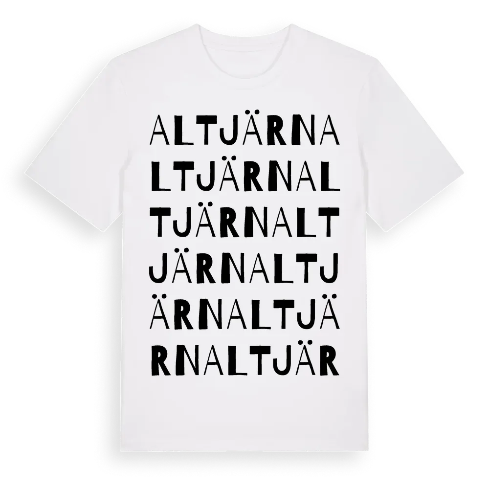 Altjärn ordlek t-shirt är inspirerad av Altjärn i Västerbottens län, Sverige. Tröjan är designad för dig som har en speciell koppling till platsen – oavsett om du bor här, har rötterna här eller bara älskar Altjärn.