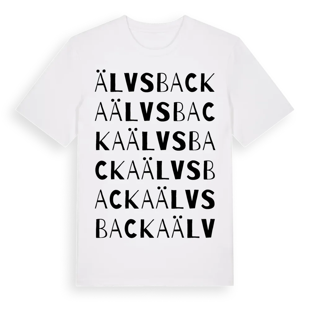 Älvsbacka ordlek t-shirt är inspirerad av stadsdelen Älvsbacka i Västerbottens län, Sverige. Tröjan är designad för dig som har en speciell koppling till platsen – oavsett om du bor här, har rötterna här eller bara älskar Älvsbacka.