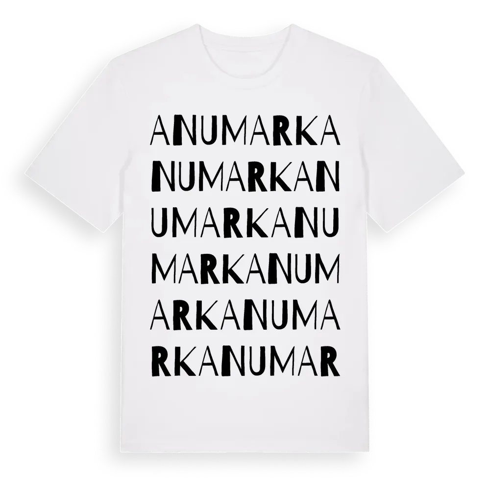 Anumark ordlek t-shirt är inspirerad av byn Anumark i Västerbottens län, Sverige. Tröjan är designad för dig som har en speciell koppling till platsen – oavsett om du bor här, har rötterna här eller bara älskar Anumark.