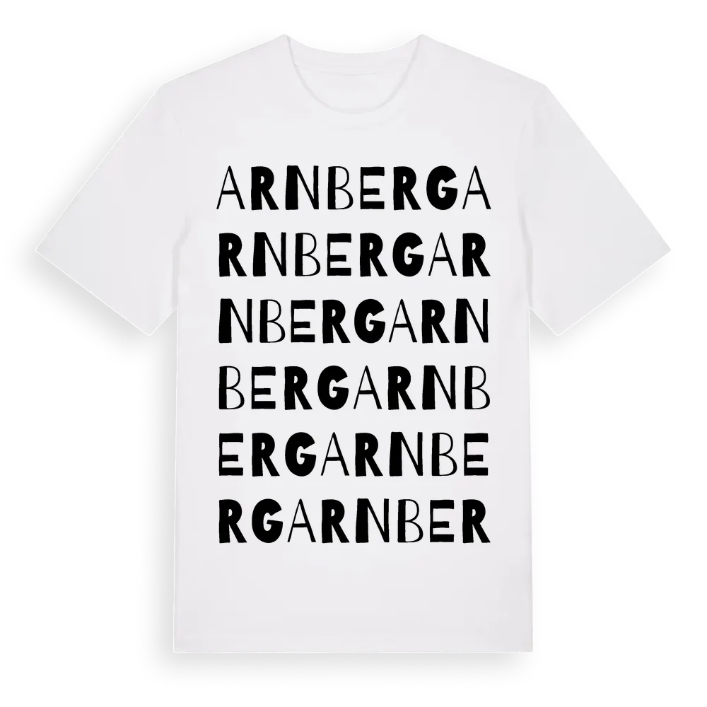 Arnberg ordlek t-shirt är inspirerad av byn Arnberg i Västerbottens län, Sverige. Tröjan är designad för dig som har en speciell koppling till platsen – oavsett om du bor här, har rötterna här eller bara älskar Arnberg.