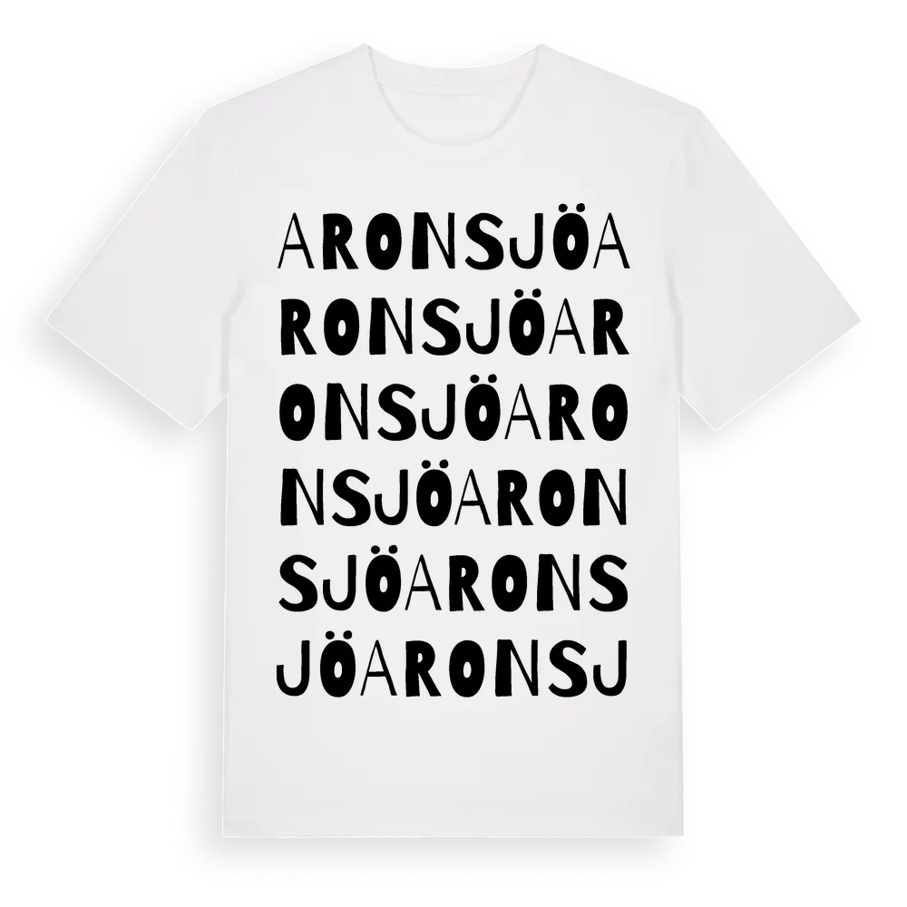 Aronsjö ordlek t-shirt är inspirerad av Aronsjö i Västerbottens län, Sverige. Tröjan är designad för dig som har en speciell koppling till platsen – oavsett om du bor här, har rötterna här eller bara älskar Aronsjö.