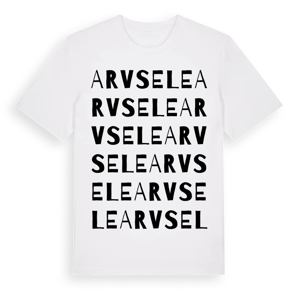 Arvsele ordlek t-shirt är inspirerad av byn Arvsele i Västerbottens län, Sverige. Tröjan är designad för dig som har en speciell koppling till platsen – oavsett om du bor här, har rötterna här eller bara älskar Arvsele.
