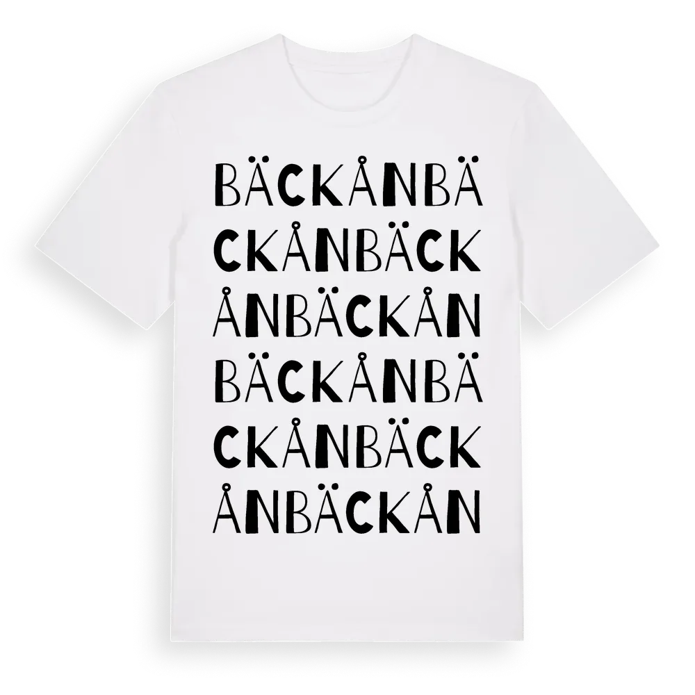 Bäckån ordlek t-shirt är inspirerad av Bäckån i Västerbottens län, Sverige. Tröjan är designad för dig som har en speciell koppling till platsen – oavsett om du bor här, har rötterna här eller bara älskar Bäckån.