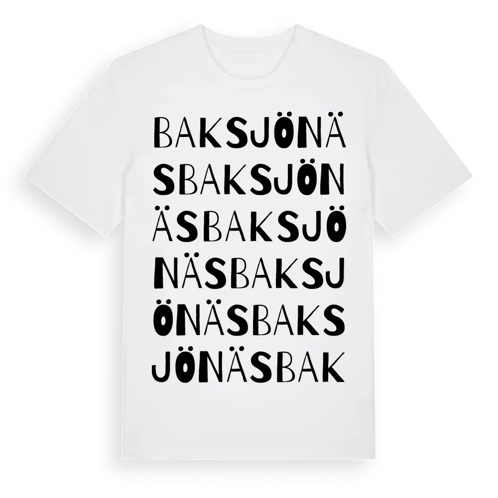 Baksjönäs ordlek t-shirt är inspirerad av Baksjönäs i Västerbottens län, Sverige. Tröjan är designad för dig som har en speciell koppling till platsen – oavsett om du bor här, har rötterna här eller bara älskar Baksjönäs.