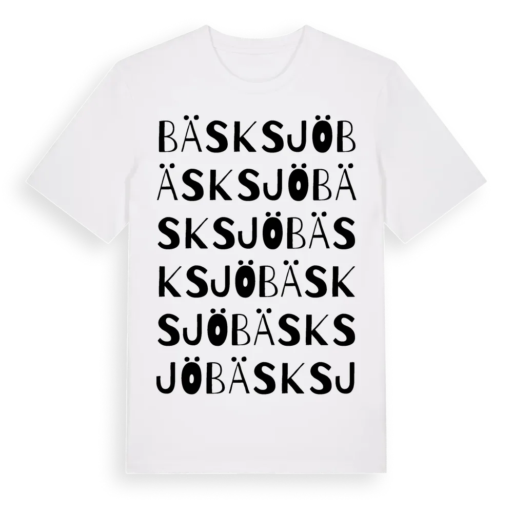 Bäsksjö ordlek t-shirt är inspirerad av byn Bäsksjö i Västerbottens län, Sverige. Tröjan är designad för dig som har en speciell koppling till platsen – oavsett om du bor här, har rötterna här eller bara älskar Bäsksjö.
