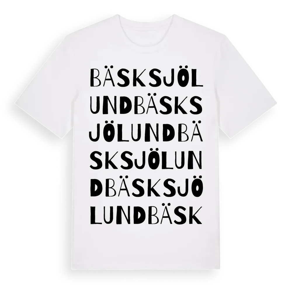 Bäsksjölund ordlek t-shirt är inspirerad av Bäsksjölund i Västerbottens län, Sverige. Tröjan är designad för dig som har en speciell koppling till platsen – oavsett om du bor här, har rötterna här eller bara älskar Bäsksjölund.