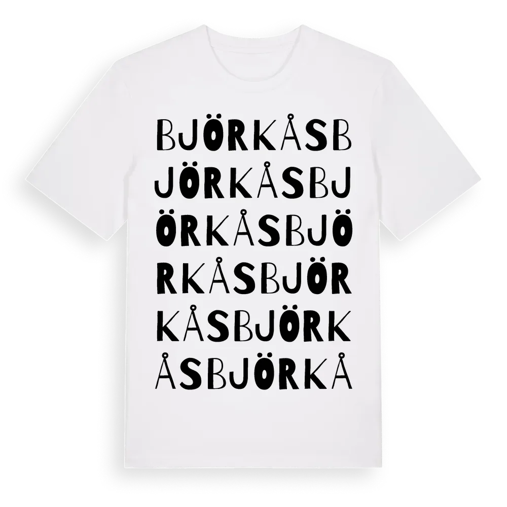 Björkås ordlek t-shirt är inspirerad av byn Björkås i Västerbottens län, Sverige. Tröjan är designad för dig som har en speciell koppling till platsen – oavsett om du bor här, har rötterna här eller bara älskar Björkås.
