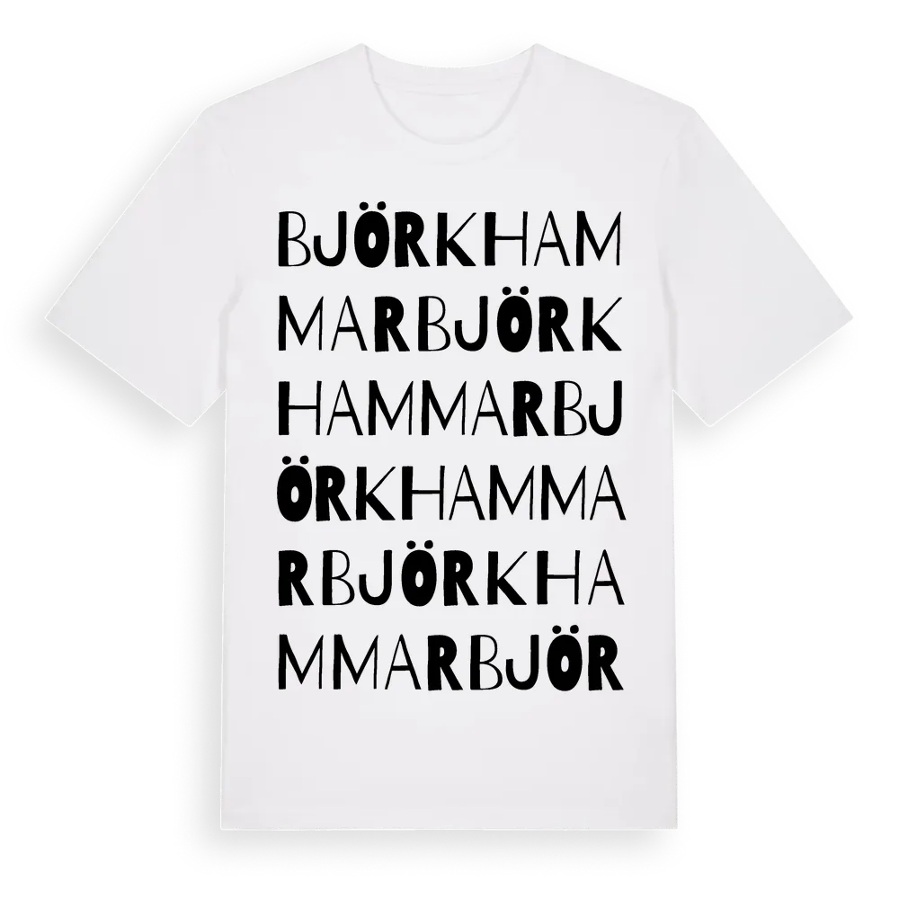 Björkhammar ordlek t-shirt är inspirerad av Björkhammar i Västerbottens län, Sverige. Tröjan är designad för dig som har en speciell koppling till platsen – oavsett om du bor här, har rötterna här eller bara älskar Björkhammar.