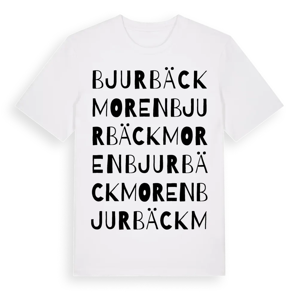 Bjurbäckmoren ordlek t-shirt är inspirerad av Bjurbäckmoren i Västerbottens län, Sverige. Tröjan är designad för dig som har en speciell koppling till platsen – oavsett om du bor här, har rötterna här eller bara älskar Bjurbäckmoren.