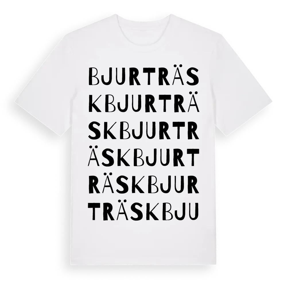Bjurträsk ordlek t-shirt är inspirerad av byn Bjurträsk i Västerbottens län, Sverige. Tröjan är designad för dig som har en speciell koppling till platsen – oavsett om du bor här, har rötterna här eller bara älskar Bjurträsk.