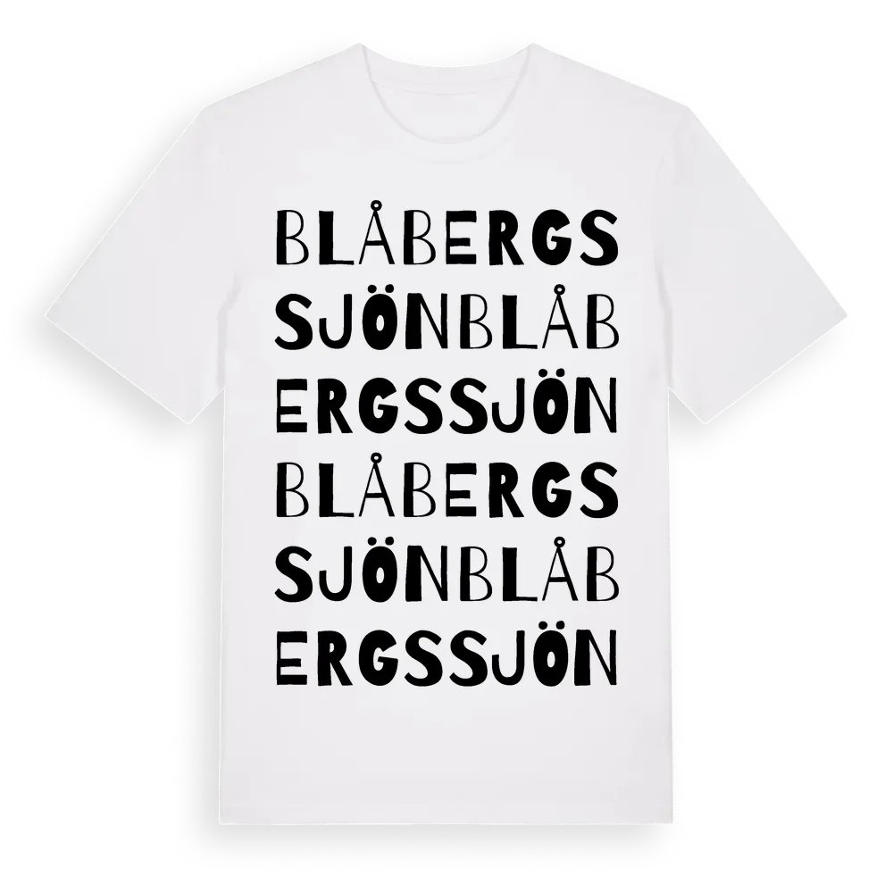 Blåbergssjön ordlek t-shirt är inspirerad av Blåbergssjön i Västerbottens län, Sverige. Tröjan är designad för dig som har en speciell koppling till platsen – oavsett om du bor här, har rötterna här eller bara älskar Blåbergssjön.