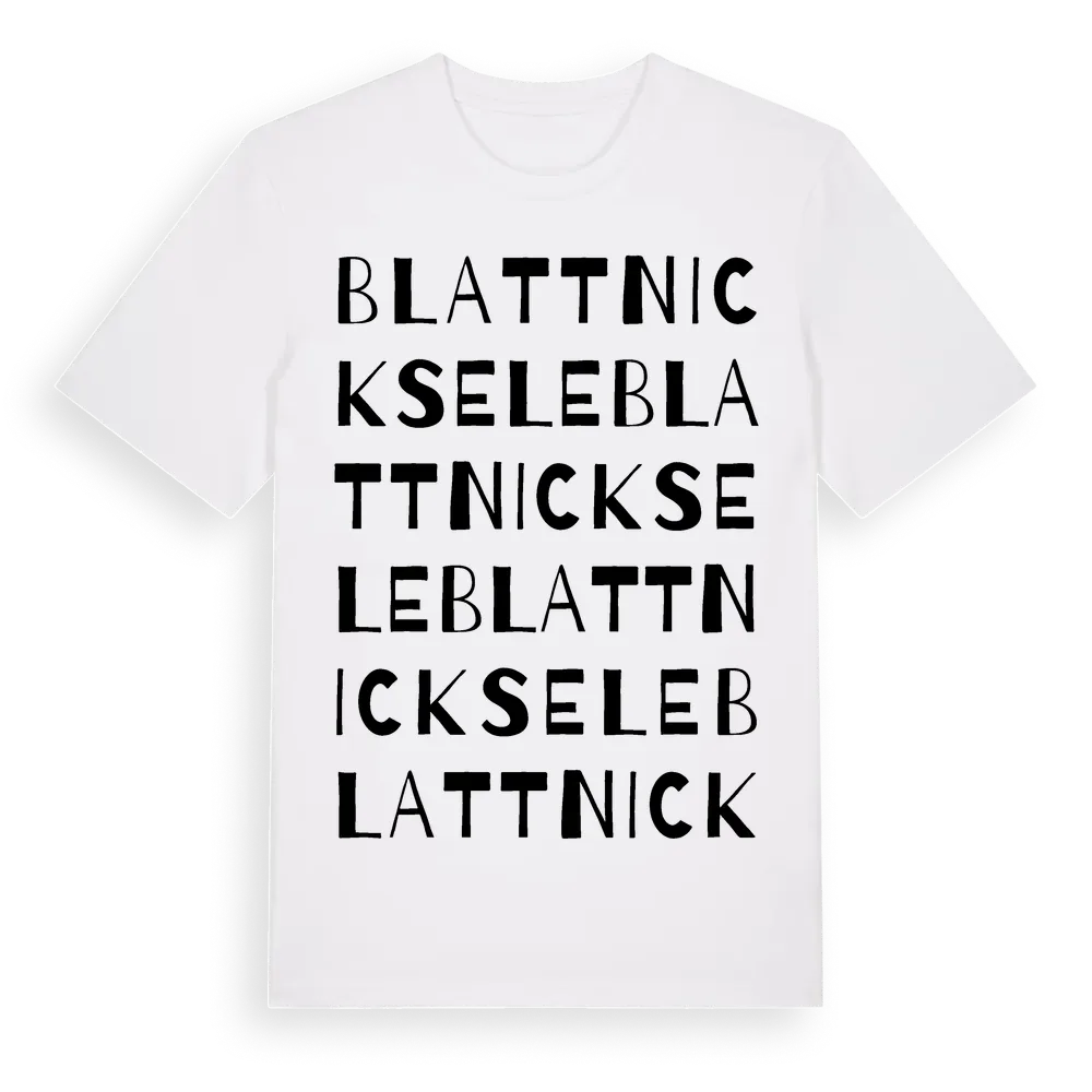 Blattnicksele ordlek t-shirt är inspirerad av byn Blattnicksele i Västerbottens län, Sverige. Tröjan är designad för dig som har en speciell koppling till platsen – oavsett om du bor här, har rötterna här eller bara älskar Blattnicksele.