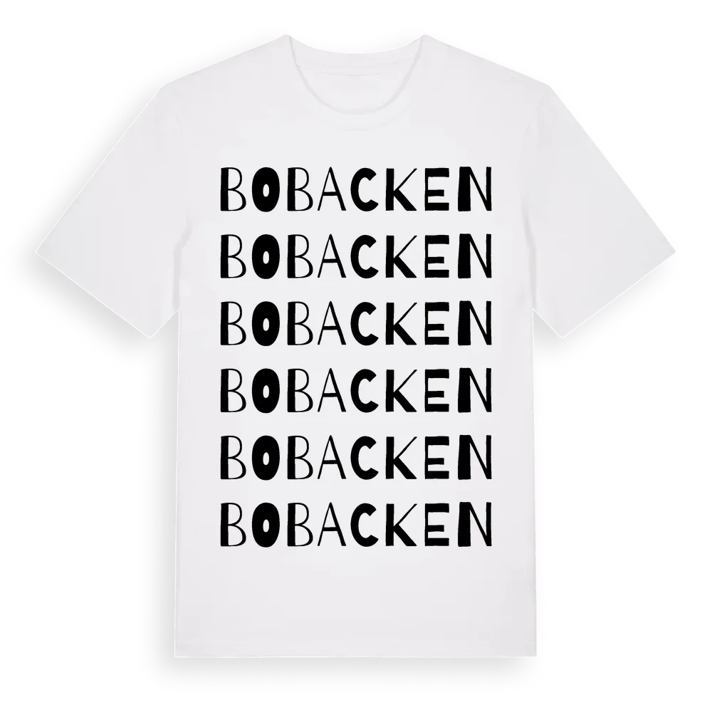 Bobacken ordlek t-shirt är inspirerad av byn Bobacken i Västerbottens län, Sverige. Tröjan är designad för dig som har en speciell koppling till platsen – oavsett om du bor här, har rötterna här eller bara älskar Bobacken.