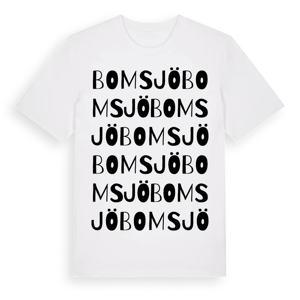 Bomsjö ordlek t-shirt är inspirerad av Bomsjö i Västerbottens län, Sverige. Tröjan är designad för dig som har en speciell koppling till platsen – oavsett om du bor här, har rötterna här eller bara älskar Bomsjö.