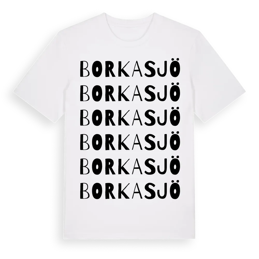 Borkasjö ordlek t-shirt är inspirerad av byn Borkasjö i Västerbottens län, Sverige. Tröjan är designad för dig som har en speciell koppling till platsen – oavsett om du bor här, har rötterna här eller bara älskar Borkasjö.
