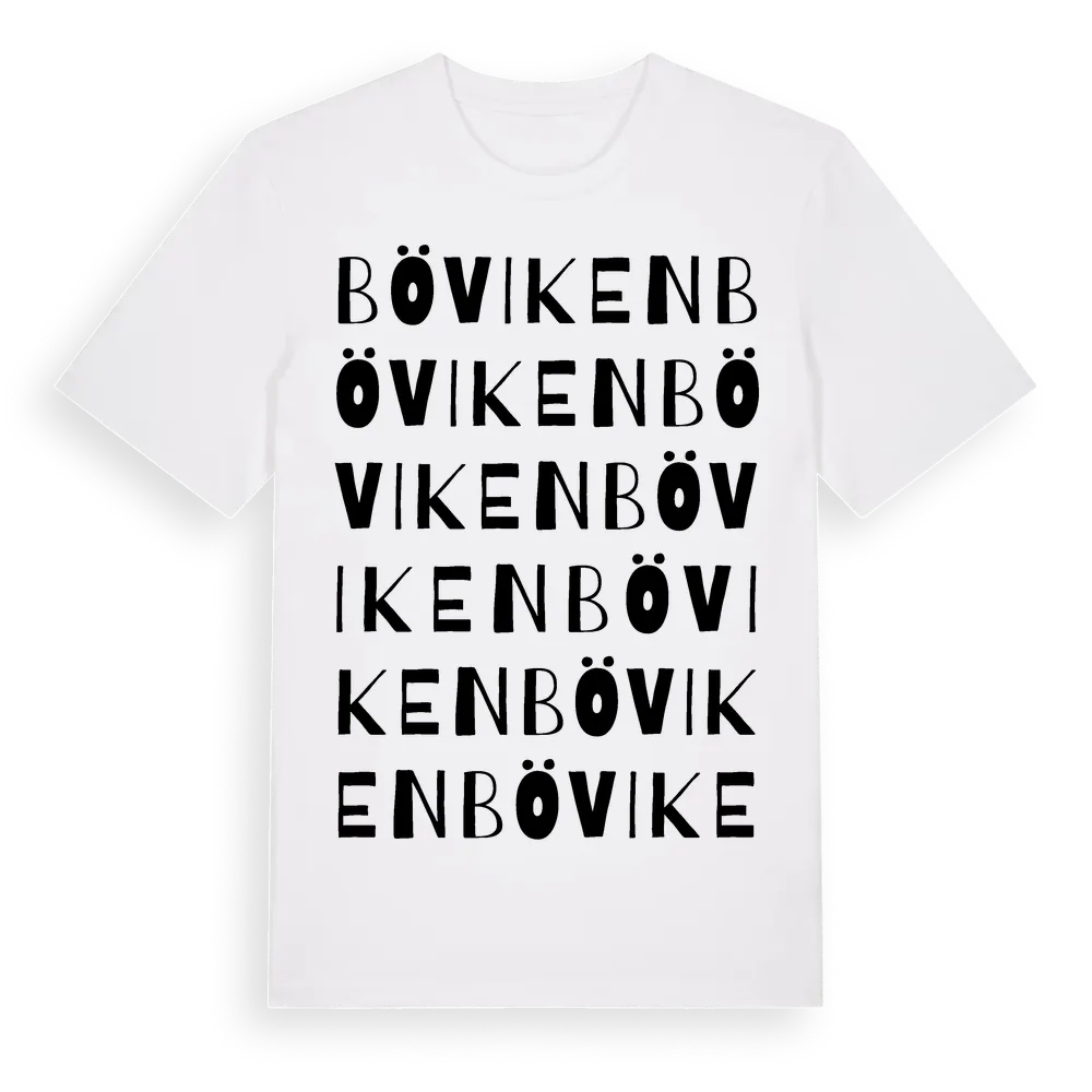 Böviken ordlek t-shirt är inspirerad av byn Böviken i Västerbottens län, Sverige. Tröjan är designad för dig som har en speciell koppling till platsen – oavsett om du bor här, har rötterna här eller bara älskar Böviken.