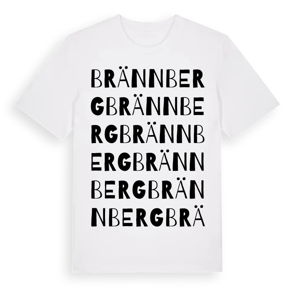 Brännberg ordlek t-shirt är inspirerad av Brännberg i Västerbottens län, Sverige. Tröjan är designad för dig som har en speciell koppling till platsen – oavsett om du bor här, har rötterna här eller bara älskar Brännberg.
