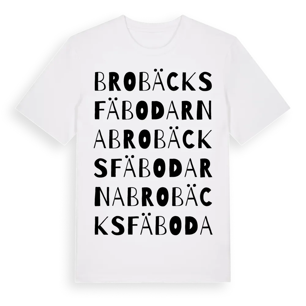 Brobäcksfäbodarna ordlek t-shirt är inspirerad av Brobäcksfäbodarna i Västerbottens län, Sverige. Tröjan är designad för dig som har en speciell koppling till platsen – oavsett om du bor här, har rötterna här eller bara älskar Brobäcksfäbodarna.
