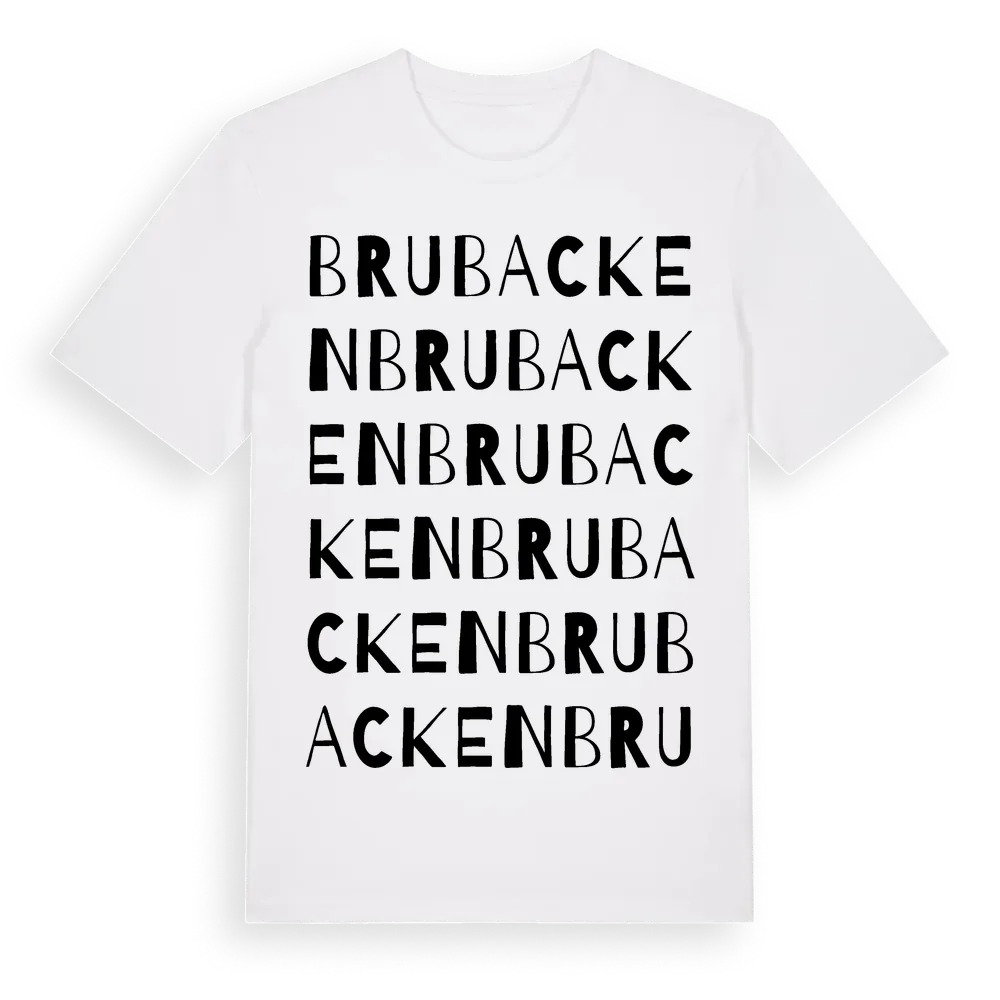 Brubacken ordlek t-shirt är inspirerad av Brubacken i Västerbottens län, Sverige. Tröjan är designad för dig som har en speciell koppling till platsen – oavsett om du bor här, har rötterna här eller bara älskar Brubacken.