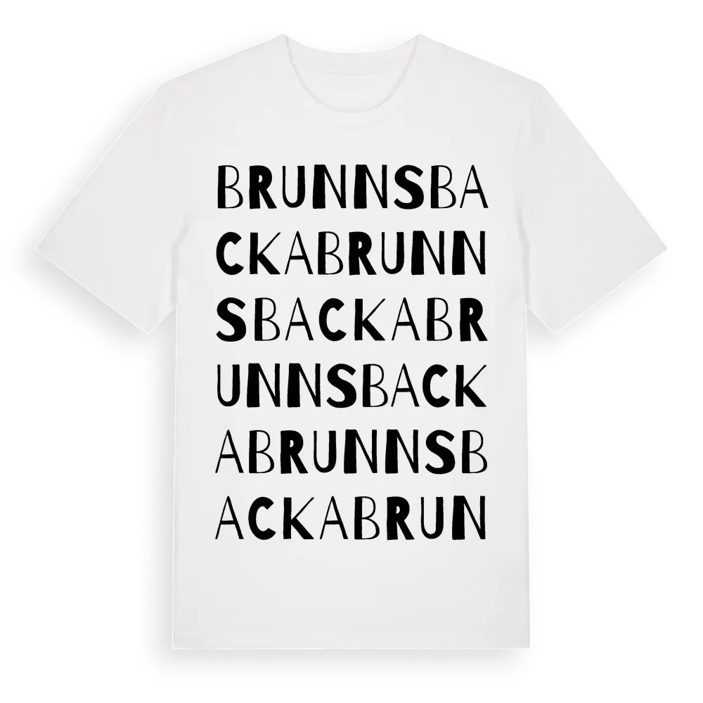 Brunnsbacka ordlek t-shirt är inspirerad av Brunnsbacka i Västerbottens län, Sverige. Tröjan är designad för dig som har en speciell koppling till platsen – oavsett om du bor här, har rötterna här eller bara älskar Brunnsbacka.
