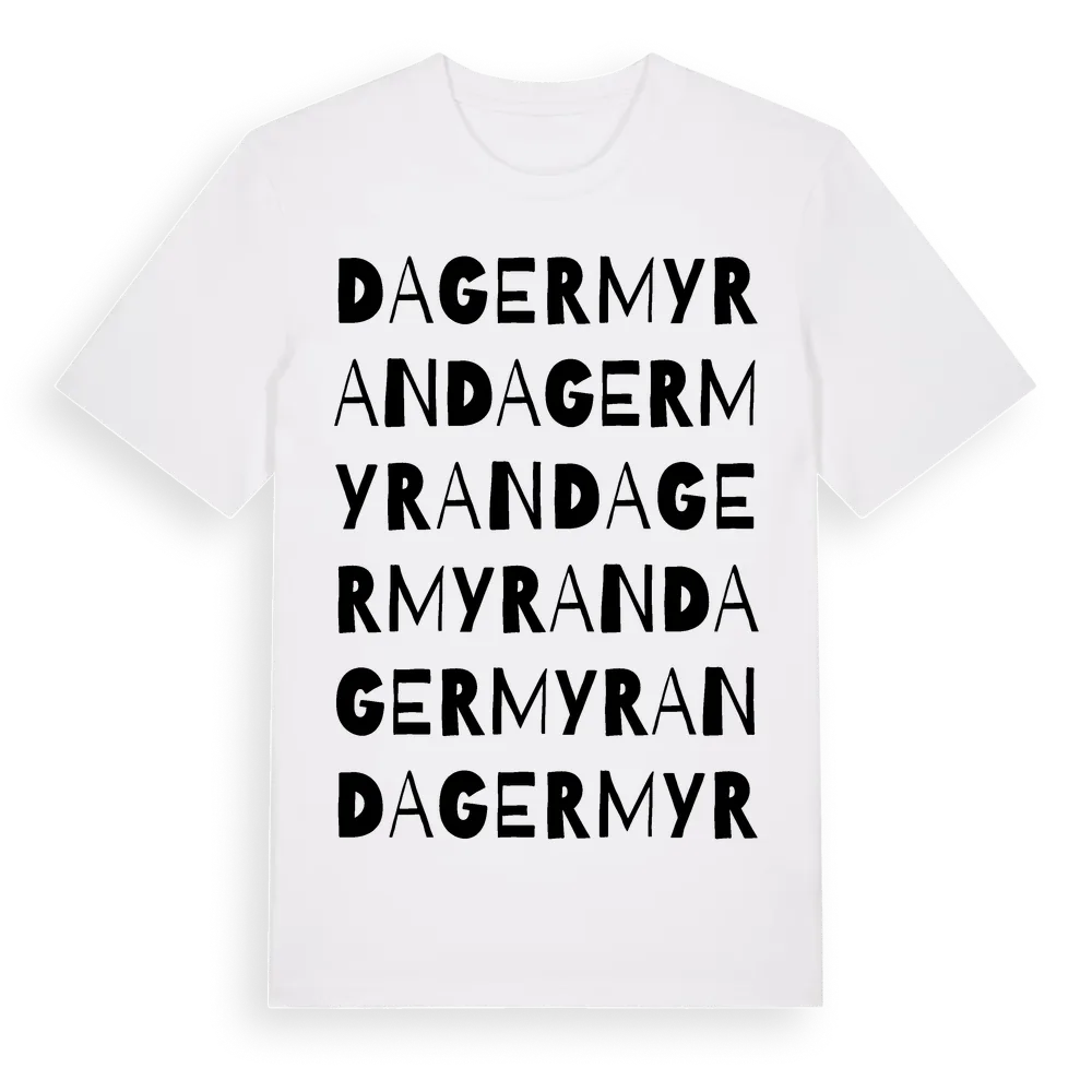 Dagermyran ordlek t-shirt är inspirerad av Dagermyran i Västerbottens län, Sverige. Tröjan är designad för dig som har en speciell koppling till platsen – oavsett om du bor här, har rötterna här eller bara älskar Dagermyran.
