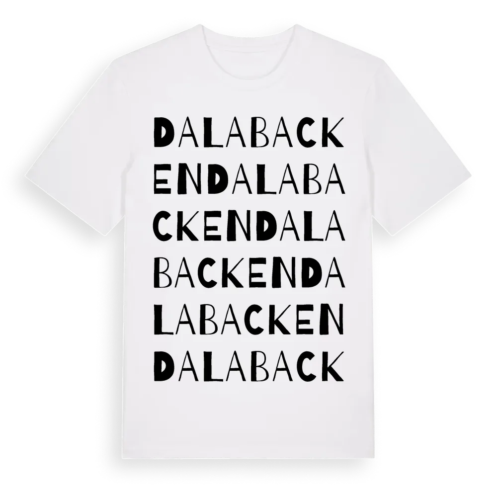 Dalabacken ordlek t-shirt är inspirerad av Dalabacken i Västerbottens län, Sverige. Tröjan är designad för dig som har en speciell koppling till platsen – oavsett om du bor här, har rötterna här eller bara älskar Dalabacken.