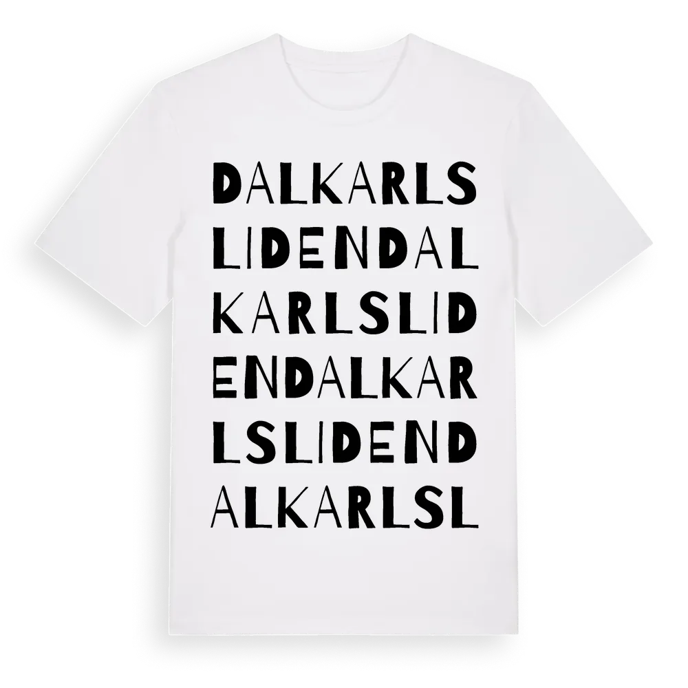 Dalkarlsliden ordlek t-shirt är inspirerad av byn Dalkarlsliden i Västerbottens län, Sverige. Tröjan är designad för dig som har en speciell koppling till platsen – oavsett om du bor här, har rötterna här eller bara älskar Dalkarlsliden.