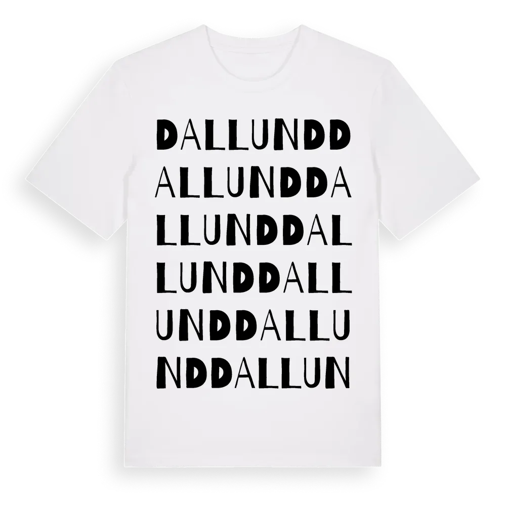 Dallund ordlek t-shirt är inspirerad av Dallund i Västerbottens län, Sverige. Tröjan är designad för dig som har en speciell koppling till platsen – oavsett om du bor här, har rötterna här eller bara älskar Dallund.