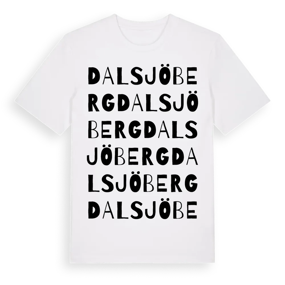 Dalsjöberg ordlek t-shirt är inspirerad av Dalsjöberg i Västerbottens län, Sverige. Tröjan är designad för dig som har en speciell koppling till platsen – oavsett om du bor här, har rötterna här eller bara älskar Dalsjöberg.