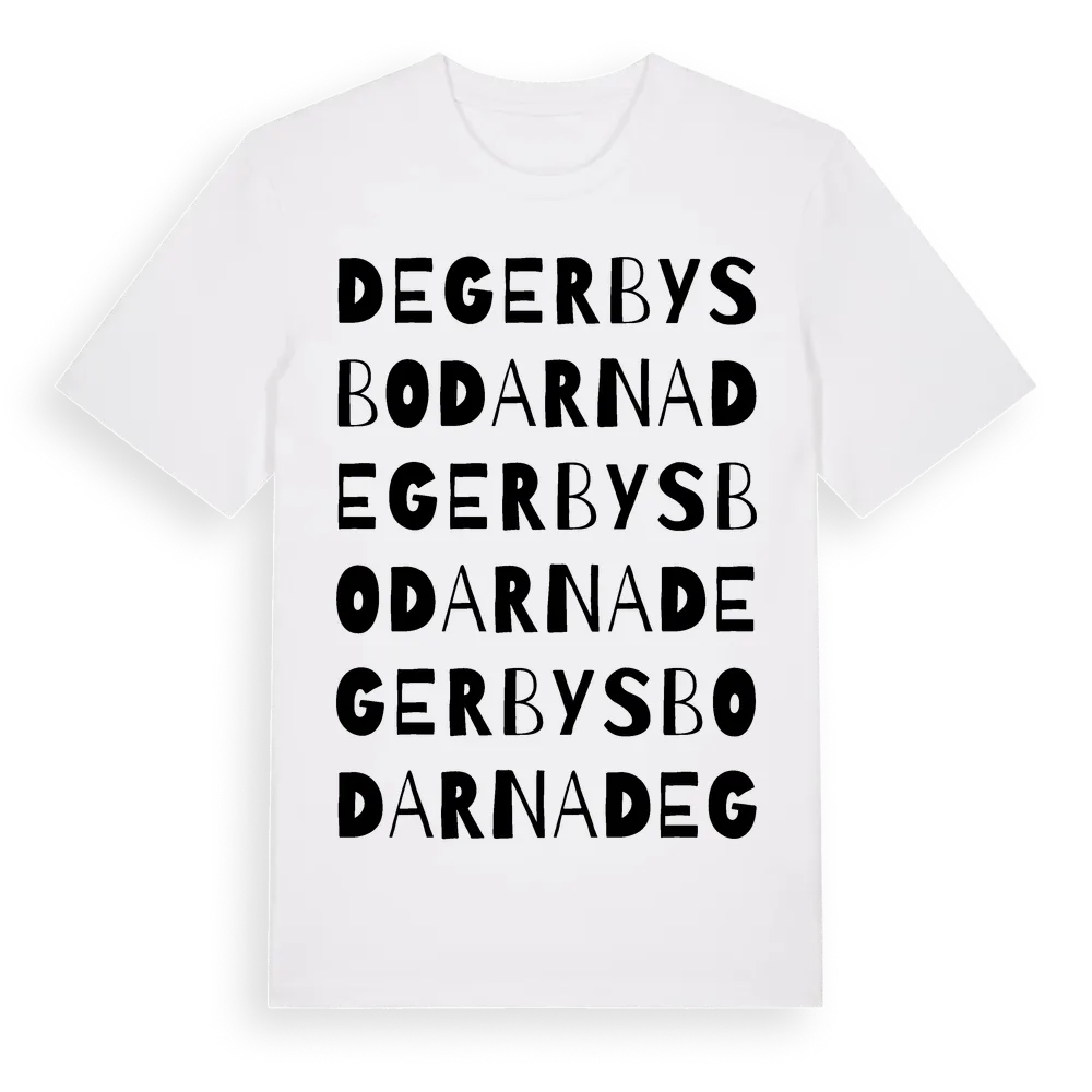 Degerbysbodarna ordlek t-shirt är inspirerad av Degerbysbodarna i Västerbottens län, Sverige. Tröjan är designad för dig som har en speciell koppling till platsen – oavsett om du bor här, har rötterna här eller bara älskar Degerbysbodarna.