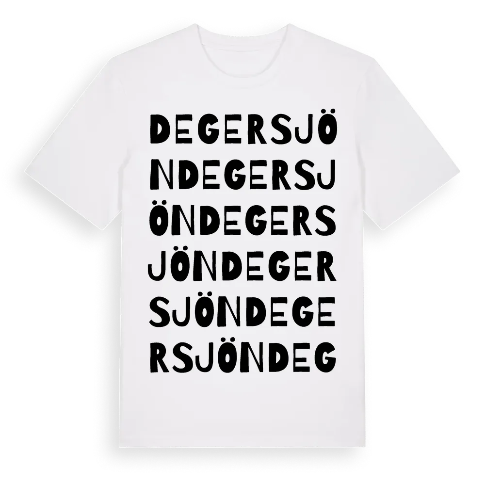 Degersjön ordlek t-shirt är inspirerad av byn Degersjön i Västerbottens län, Sverige. Tröjan är designad för dig som har en speciell koppling till platsen – oavsett om du bor här, har rötterna här eller bara älskar Degersjön.