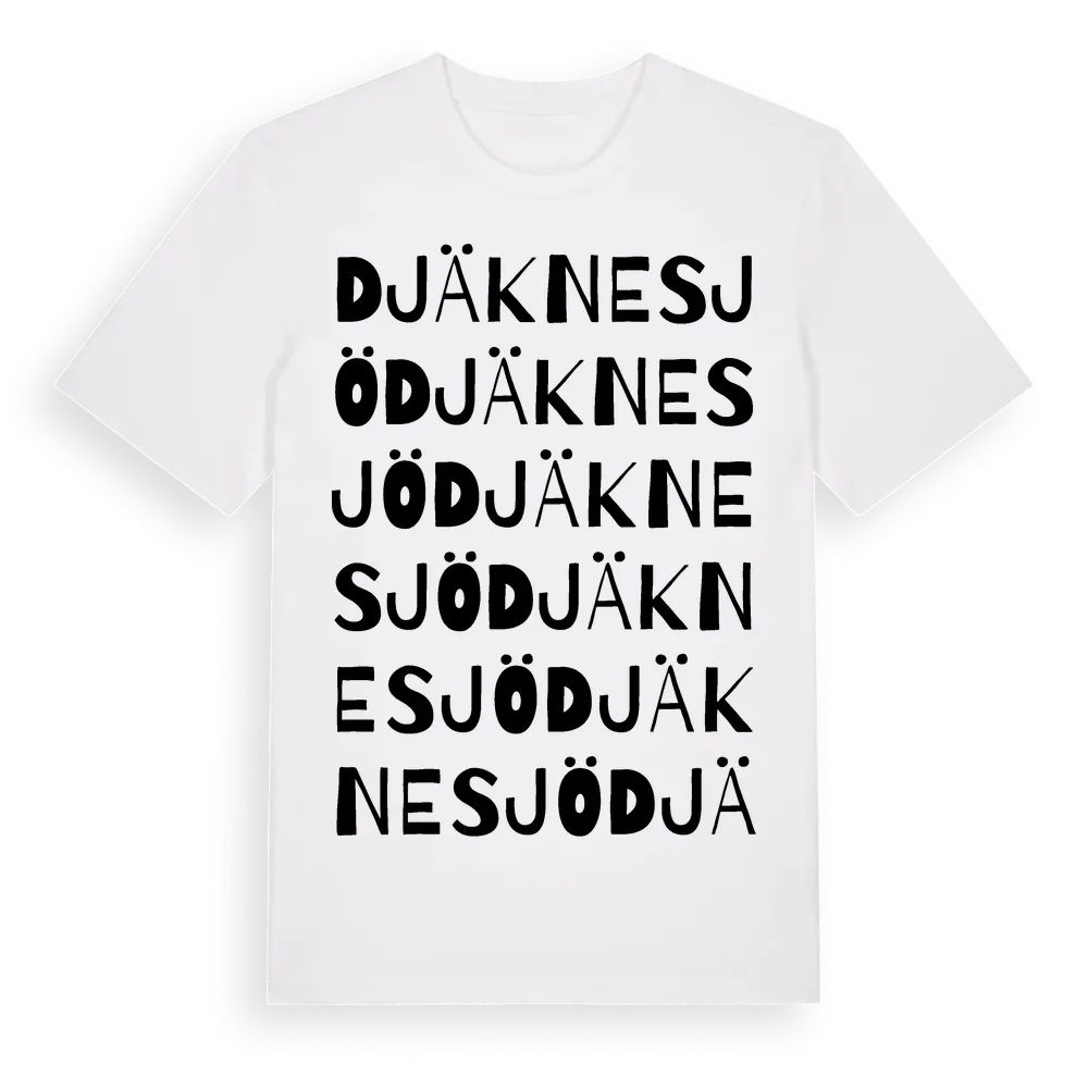 Djäknesjö ordlek t-shirt är inspirerad av Djäknesjö i Västerbottens län, Sverige. Tröjan är designad för dig som har en speciell koppling till platsen – oavsett om du bor här, har rötterna här eller bara älskar Djäknesjö.