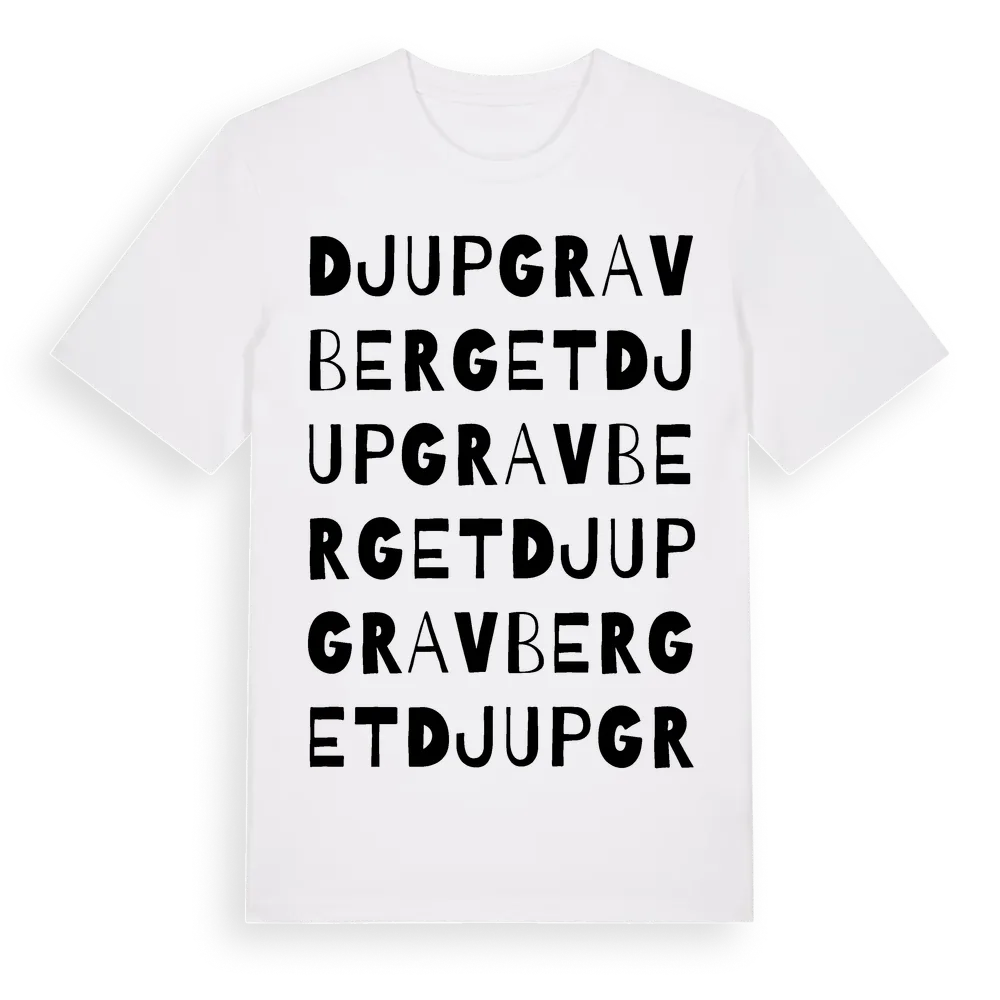 Djupgravberget ordlek t-shirt är inspirerad av Djupgravberget i Västerbottens län, Sverige. Tröjan är designad för dig som har en speciell koppling till platsen – oavsett om du bor här, har rötterna här eller bara älskar Djupgravberget.