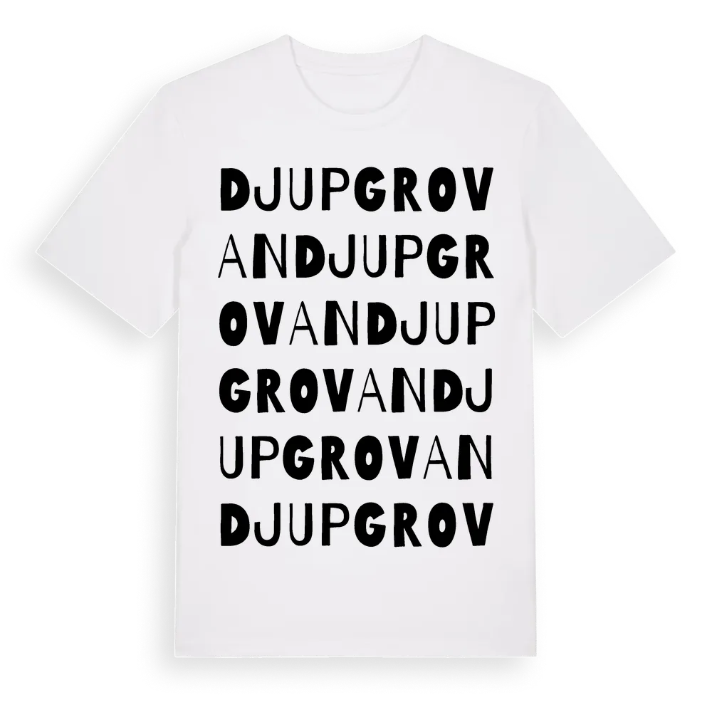 Djupgrovan ordlek t-shirt är inspirerad av byn Djupgrovan i Västerbottens län, Sverige. Tröjan är designad för dig som har en speciell koppling till platsen – oavsett om du bor här, har rötterna här eller bara älskar Djupgrovan.