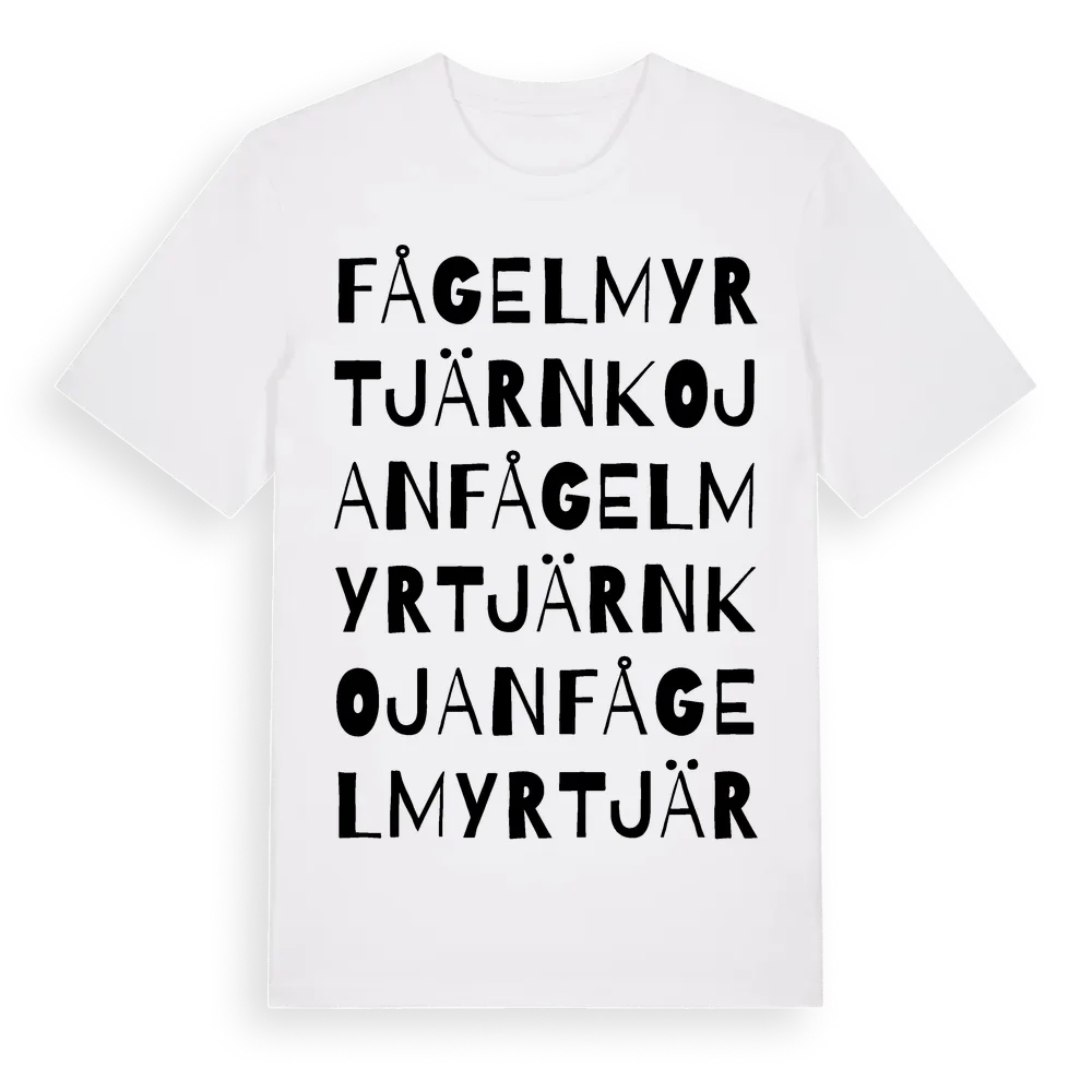 Fågelmyrtjärnkojan ordlek t-shirt är inspirerad av Fågelmyrtjärnkojan i Västerbottens län, Sverige. Tröjan är designad för dig som har en speciell koppling till platsen – oavsett om du bor här, har rötterna här eller bara älskar Fågelmyrtjärnkojan.