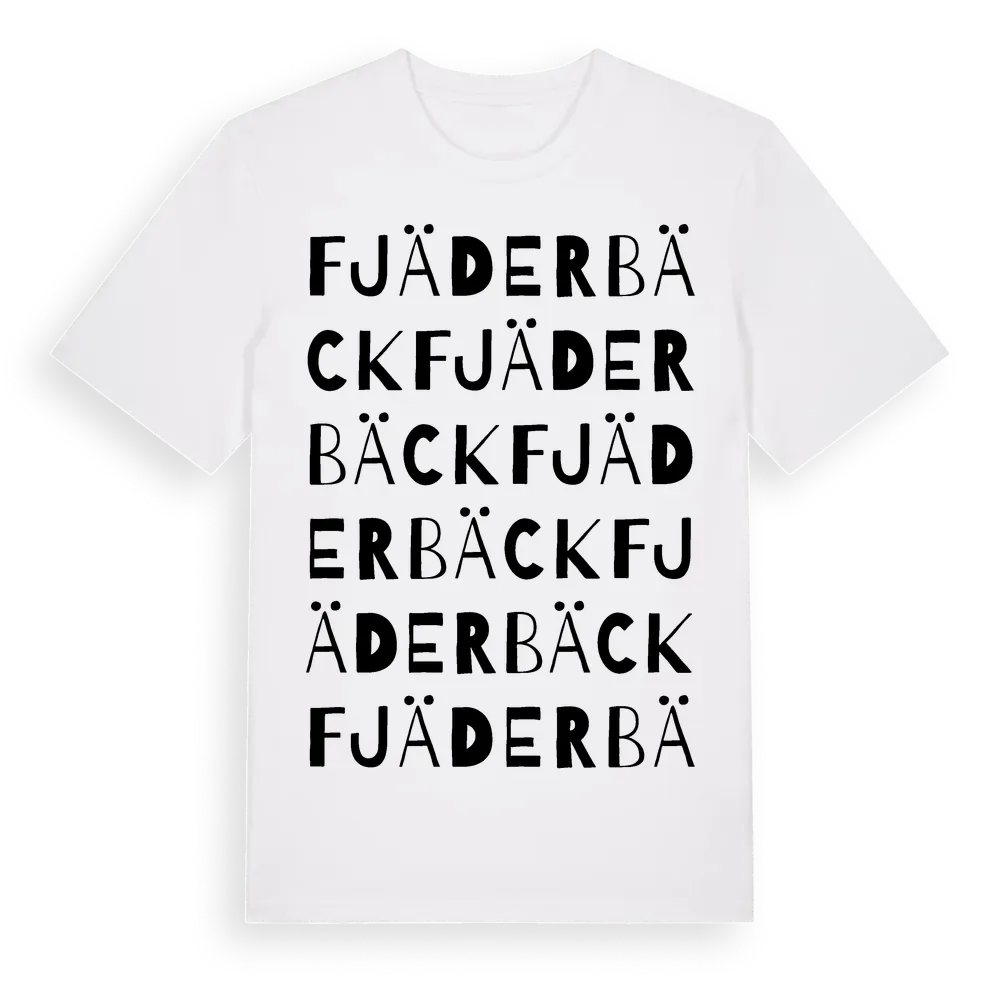 Fjäderbäck ordlek t-shirt är inspirerad av Fjäderbäck i Västerbottens län, Sverige. Tröjan är designad för dig som har en speciell koppling till platsen – oavsett om du bor här, har rötterna här eller bara älskar Fjäderbäck.