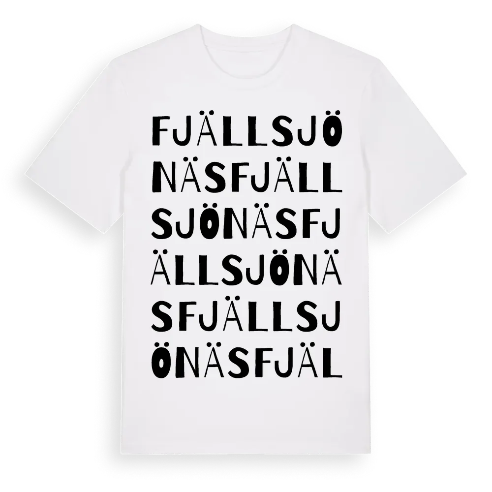 Fjällsjönäs ordlek t-shirt är inspirerad av Fjällsjönäs i Västerbottens län, Sverige. Tröjan är designad för dig som har en speciell koppling till platsen – oavsett om du bor här, har rötterna här eller bara älskar Fjällsjönäs.