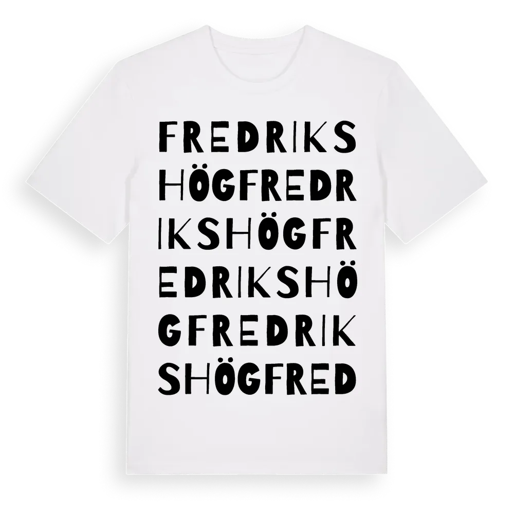 Fredrikshög ordlek t-shirt är inspirerad av stadsdelen Fredrikshög i Västerbottens län, Sverige. Tröjan är designad för dig som har en speciell koppling till platsen – oavsett om du bor här, har rötterna här eller bara älskar Fredrikshög.