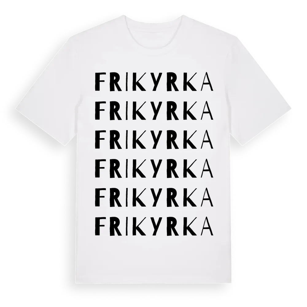 Frikyrka ordlek t-shirt är inspirerad av byn Frikyrka i Västerbottens län, Sverige. Tröjan är designad för dig som har en speciell koppling till platsen – oavsett om du bor här, har rötterna här eller bara älskar Frikyrka.