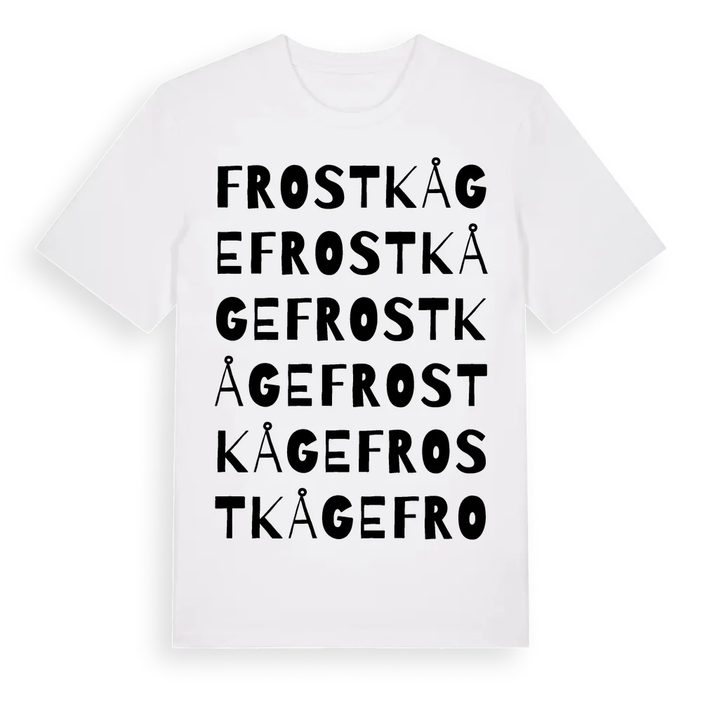 Frostkåge ordlek t-shirt är inspirerad av byn Frostkåge i Västerbottens län, Sverige. Tröjan är designad för dig som har en speciell koppling till platsen – oavsett om du bor här, har rötterna här eller bara älskar Frostkåge.