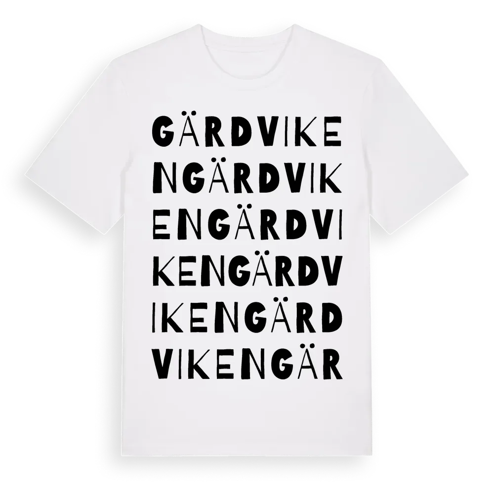 Gärdviken ordlek t-shirt är inspirerad av Gärdviken i Västerbottens län, Sverige. Tröjan är designad för dig som har en speciell koppling till platsen – oavsett om du bor här, har rötterna här eller bara älskar Gärdviken.