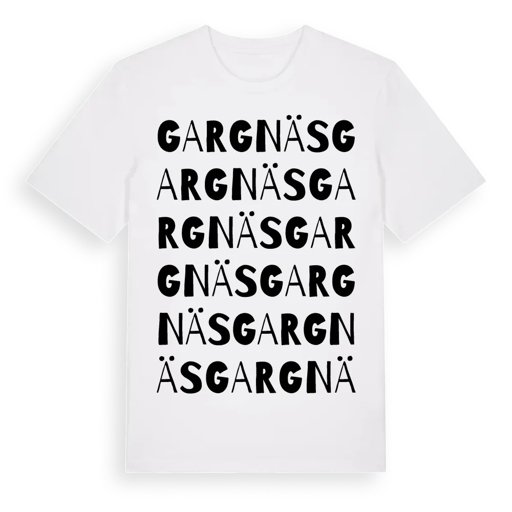 Gargnäs ordlek t-shirt är inspirerad av byn Gargnäs i Västerbottens län, Sverige. Tröjan är designad för dig som har en speciell koppling till platsen – oavsett om du bor här, har rötterna här eller bara älskar Gargnäs.
