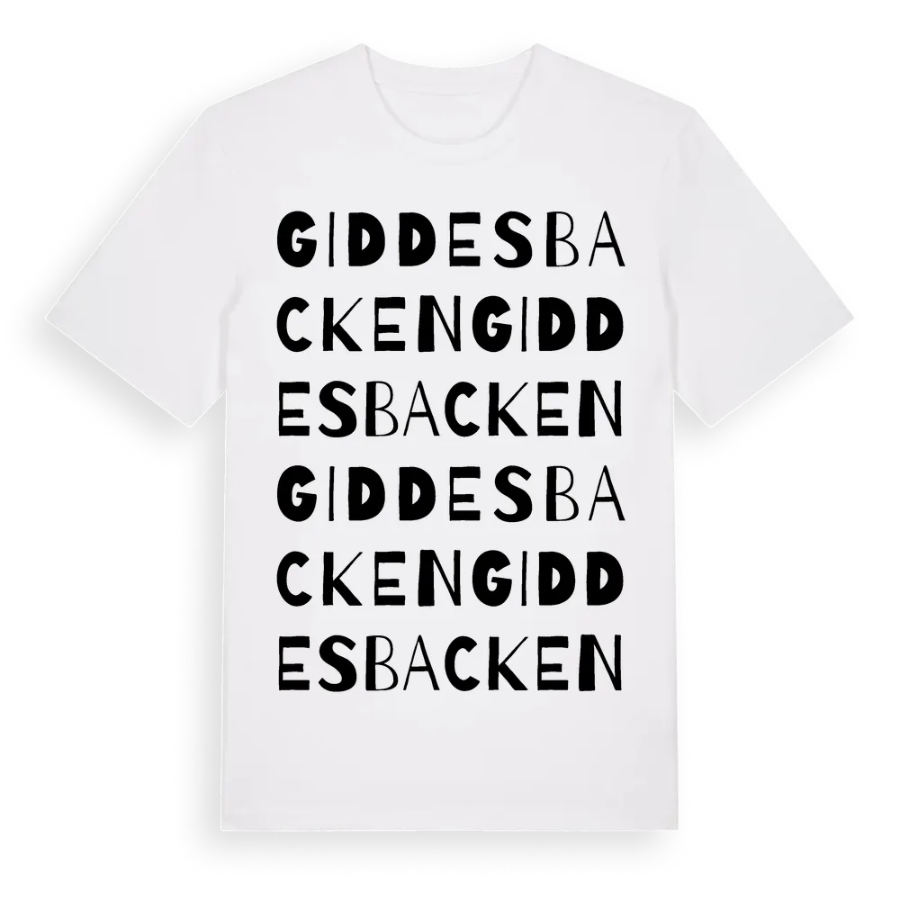 Giddesbacken ordlek t-shirt är inspirerad av Giddesbacken i Västerbottens län, Sverige. Tröjan är designad för dig som har en speciell koppling till platsen – oavsett om du bor här, har rötterna här eller bara älskar Giddesbacken.