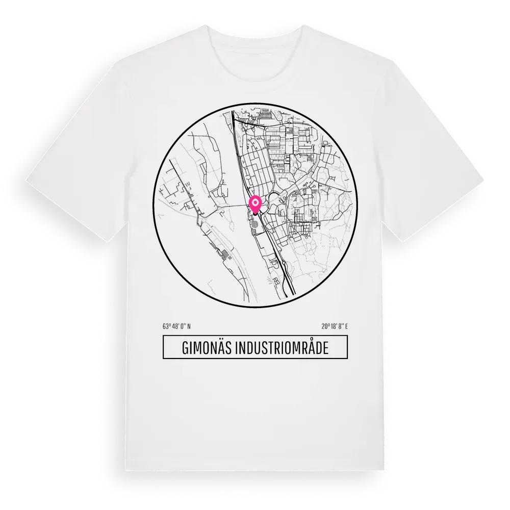 Gimonäs Industriområde t-shirt är inspirerad av Gimonäs Industriområde i Västerbottens län, Sverige. Tröjan är designad för dig som har en speciell koppling till platsen – oavsett om du bor här, har rötterna här eller bara älskar Gimonäs Industriområde.