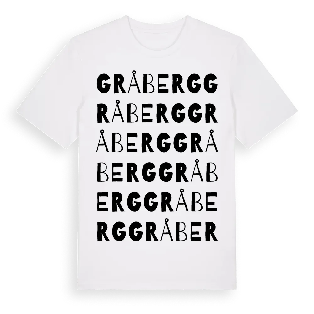 Gråberg ordlek t-shirt är inspirerad av byn Gråberg i Västerbottens län, Sverige. Tröjan är designad för dig som har en speciell koppling till platsen – oavsett om du bor här, har rötterna här eller bara älskar Gråberg.