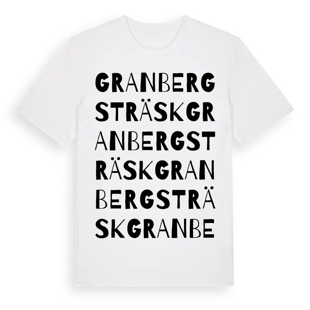 Granbergsträsk ordlek t-shirt är inspirerad av byn Granbergsträsk i Västerbottens län, Sverige. Tröjan är designad för dig som har en speciell koppling till platsen – oavsett om du bor här, har rötterna här eller bara älskar Granbergsträsk.