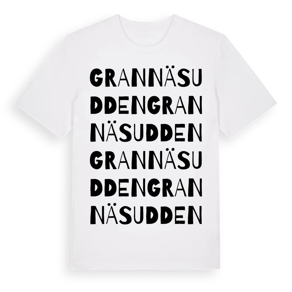 Grannäsudden ordlek t-shirt är inspirerad av Grannäsudden i Västerbottens län, Sverige. Tröjan är designad för dig som har en speciell koppling till platsen – oavsett om du bor här, har rötterna här eller bara älskar Grannäsudden.