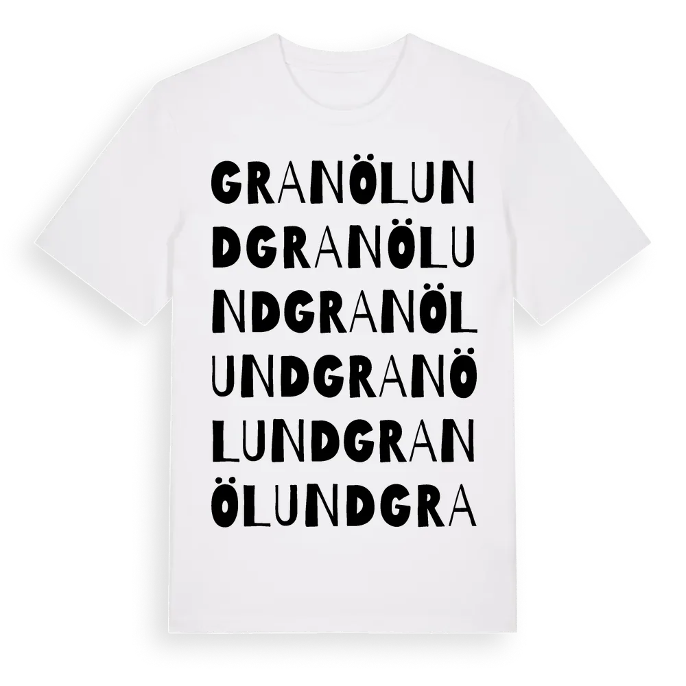 Granölund ordlek t-shirt är inspirerad av byn Granölund i Västerbottens län, Sverige. Tröjan är designad för dig som har en speciell koppling till platsen – oavsett om du bor här, har rötterna här eller bara älskar Granölund.
