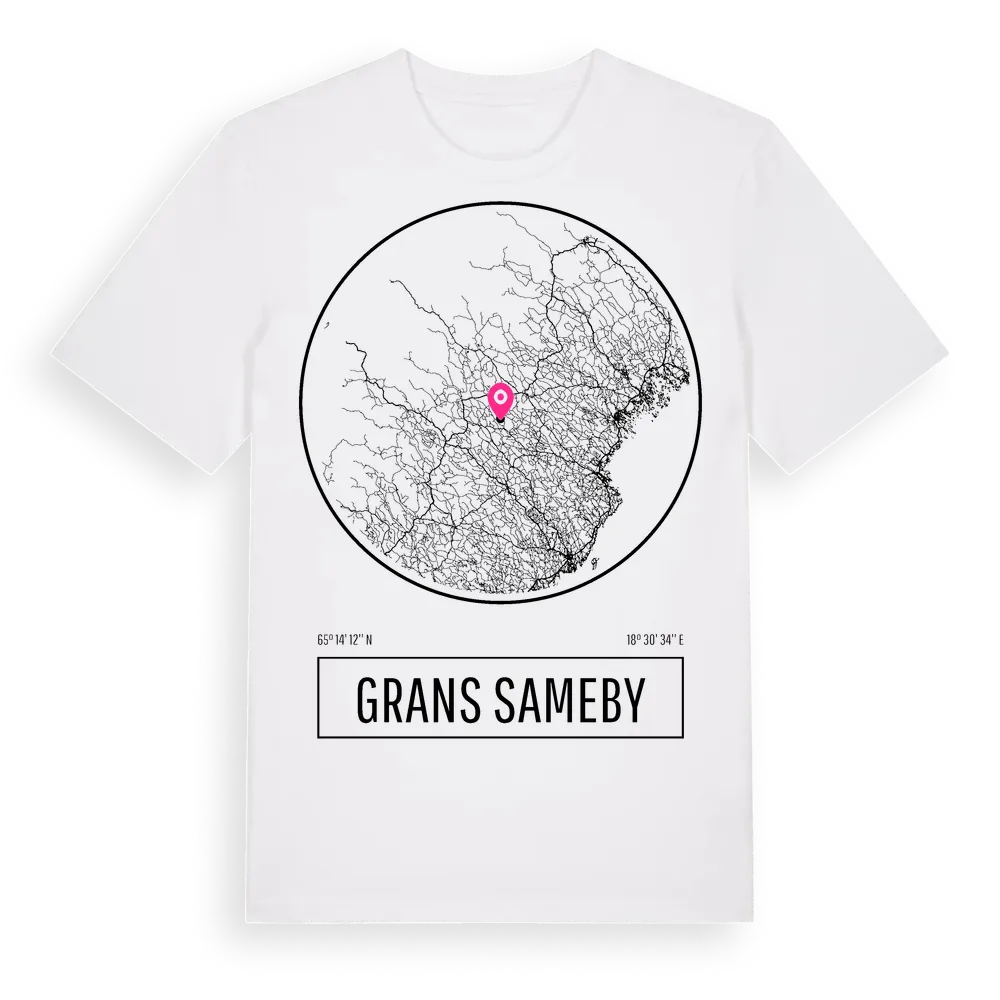 Grans Sameby t-shirt är inspirerad av Grans Sameby i Västerbottens län, Sverige. Tröjan är designad för dig som har en speciell koppling till platsen – oavsett om du bor här, har rötterna här eller bara älskar Grans Sameby.