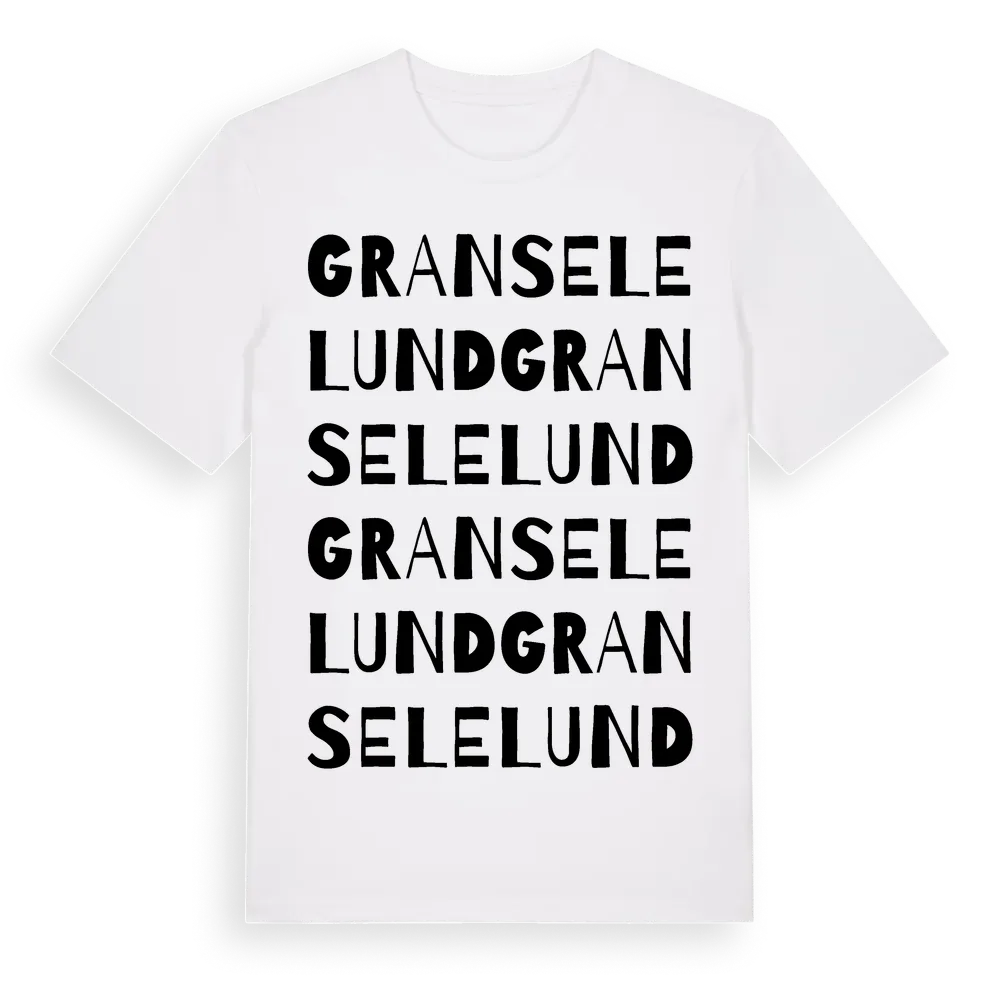 Granselelund ordlek t-shirt är inspirerad av Granselelund i Västerbottens län, Sverige. Tröjan är designad för dig som har en speciell koppling till platsen – oavsett om du bor här, har rötterna här eller bara älskar Granselelund.